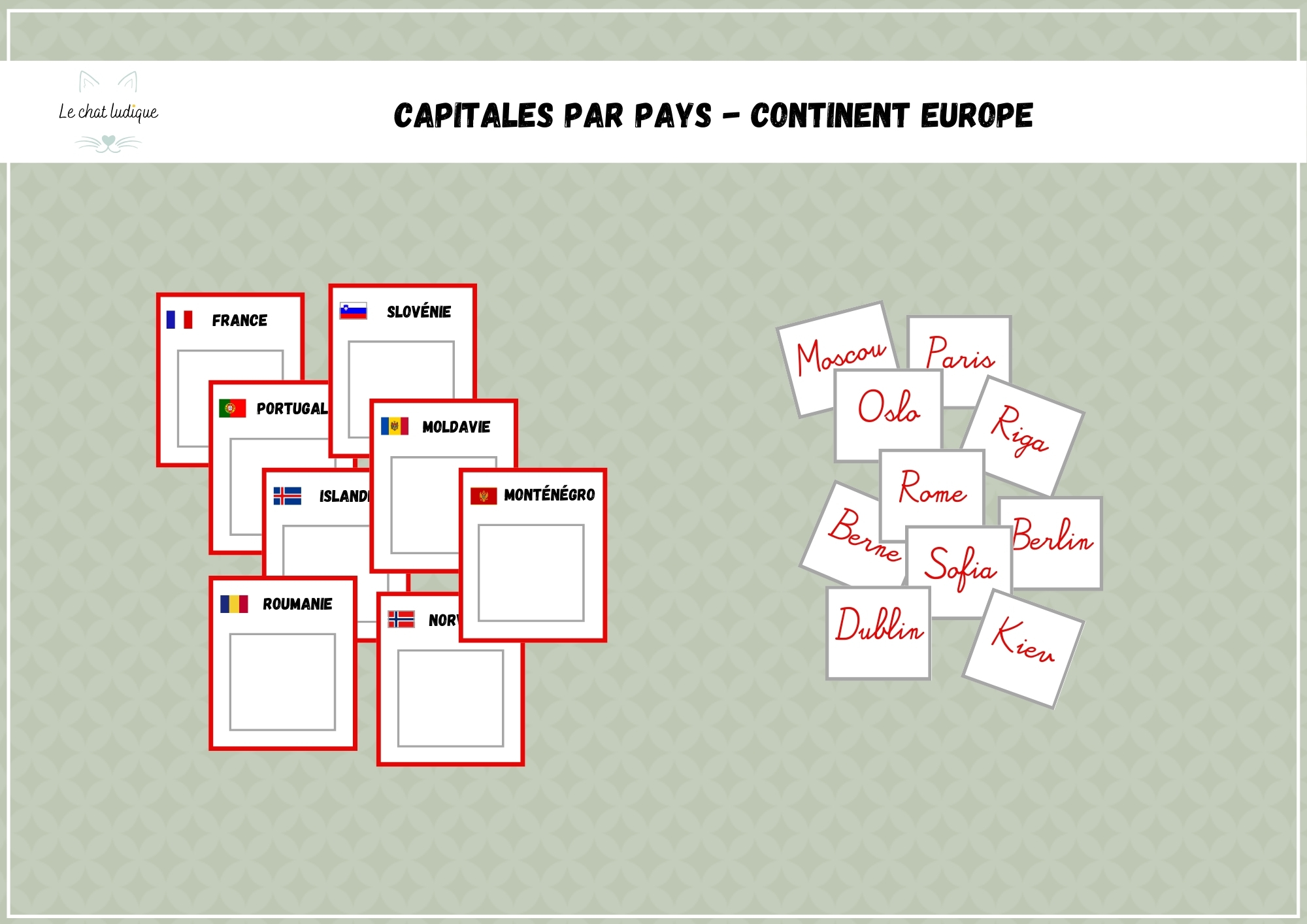À travers des cartes de nomenclature à associer, les enfants retiennent facilement les noms des pays et de leurs capitales tout en développant leur sens de l’observation et leur mémoire visuelle.