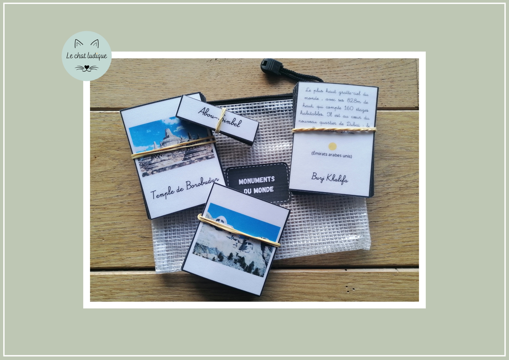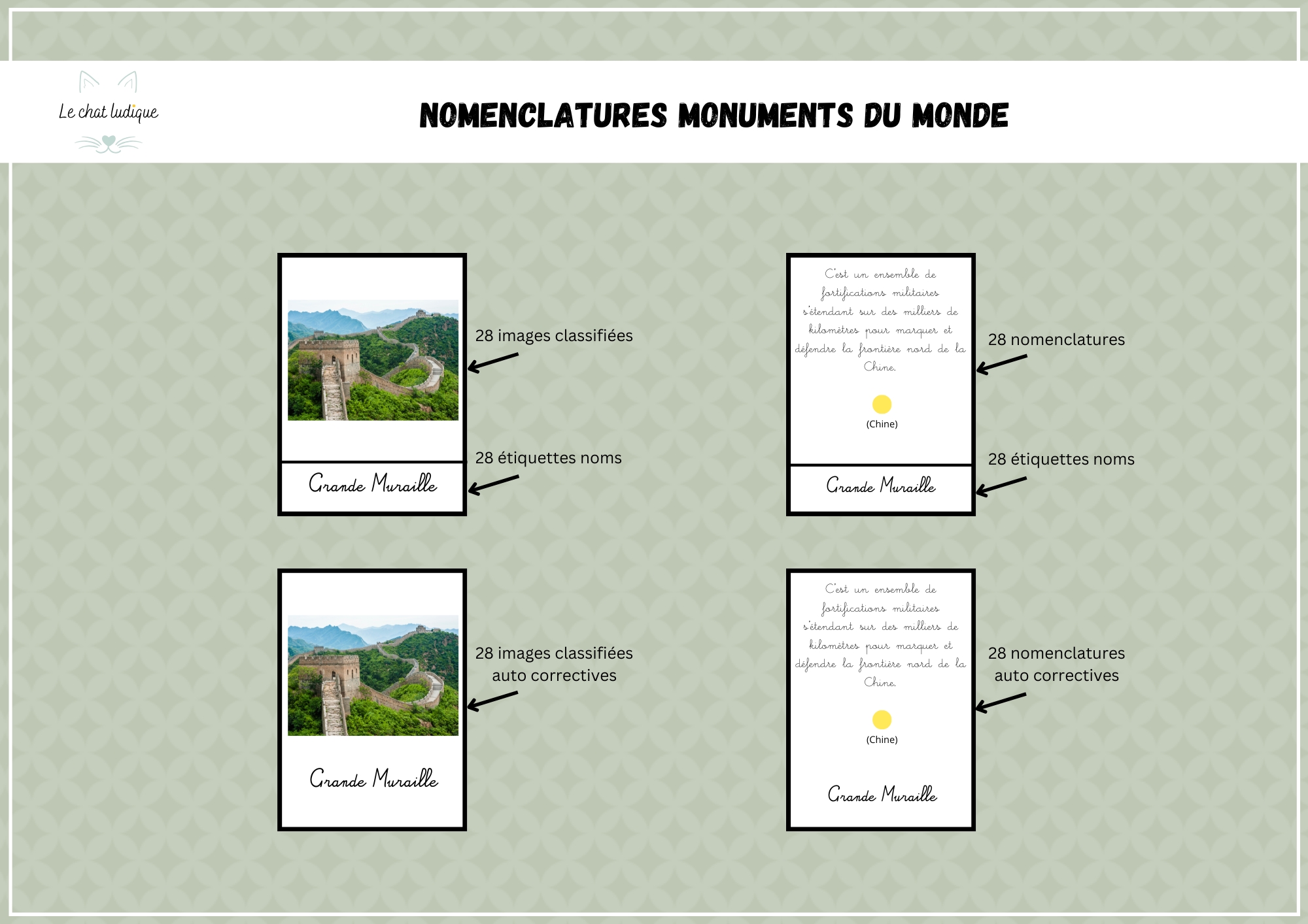 Grâce à des images classifiées et des cartes de nomenclature inspirées de la pédagogie Montessori, les enfants mémorisent visuellement les noms, origines et caractéristiques de monuments emblématiques comme la Tour Eiffel, la Grande Muraille de Chine ou les pyramides d’Égypte.
