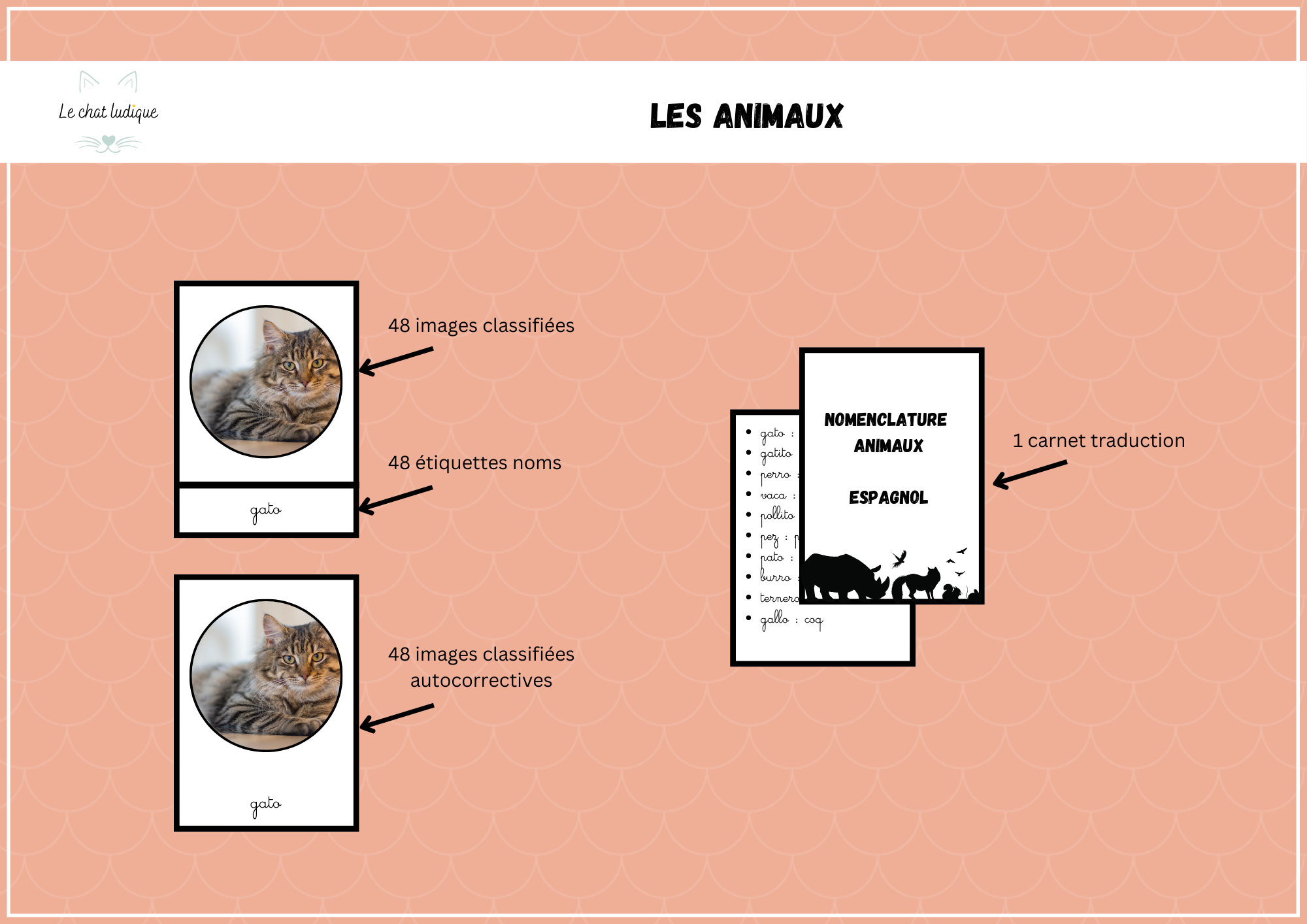 Idéal pour les enfants en pleine découverte de la langue espagnole, ce support imprimable conçue selon les principes Montessori, permet de mémoriser facilement les noms des animaux en espagnol, grâce à des activités interactives et visuelles.