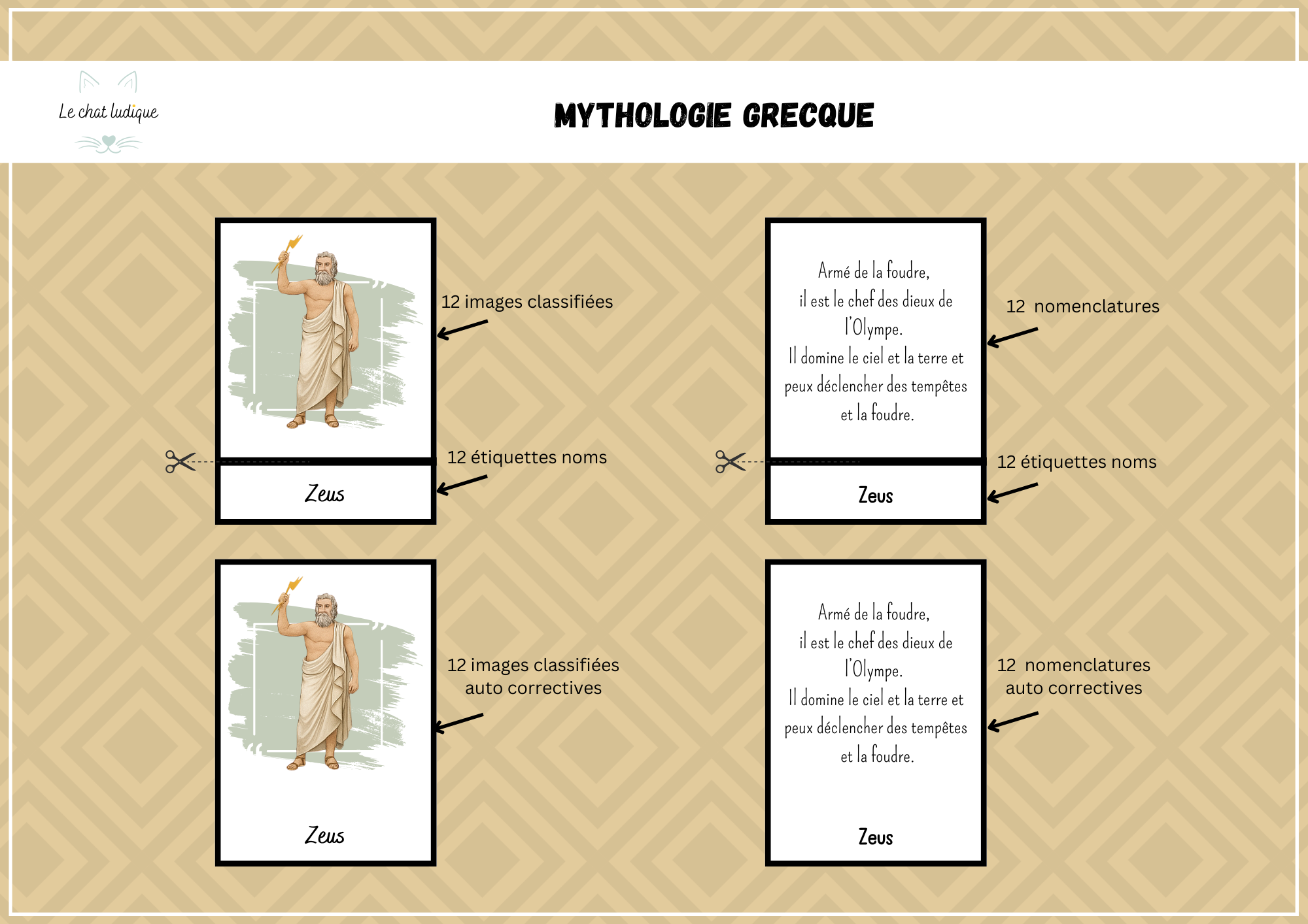 Notre ressource « Mythologie grecque – Nomenclatures & cartes classifiées Montessori » est idéale pour les enfants passionnés d’histoire, de mythes et de légendes antiques. Ce support imprimable, pensé pour un apprentissage visuel et structuré, facilite la mémorisation des figures emblématiques de l’Olympe et de leurs attributs.